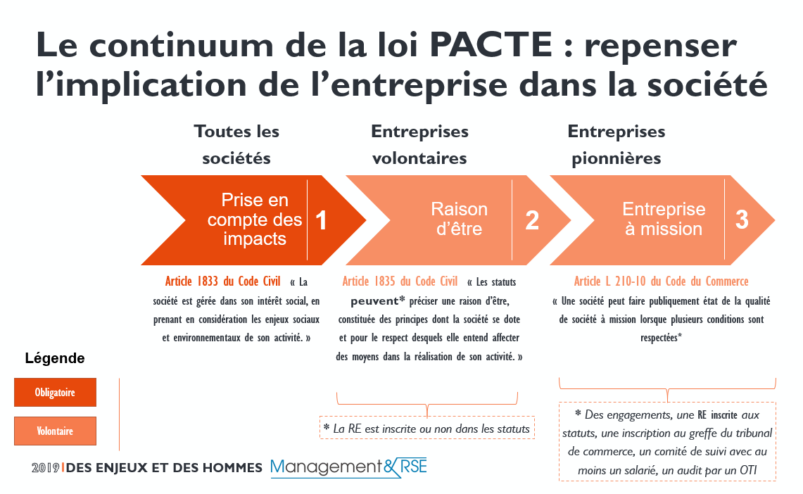Quels impacts sur le gouvernement d'entreprise · 1) modifications du code civil et du code de commerce · 2) la remuneration des dirigeants · 3) les . L'ambitieux programme de la loi pacte du 22 mai 2019 qui vise à favoriser la croissance et la transformation des entreprises se traduit, entre autres, . La loi pacte, ou plan d'action pour la croissance et la transformation des entreprises, est une loi adoptée en avril 2019 par le gouvernement d'édouard . Nous avons consacré dans le code civil la notion d'intérêt social de l'entreprise. Une entreprise doit faire des profits mais elle ne peut pas faire que cela », déclarait le 21 mars 2019, lors d'un colloque à l'assemblée à .